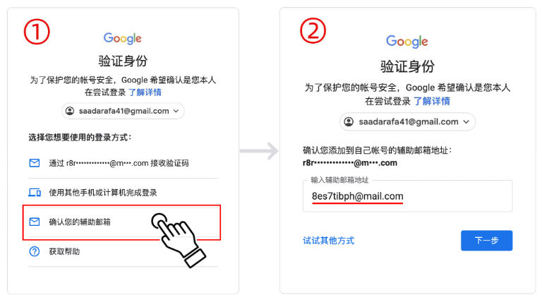 当输入完账号、密码后如果需要进行身份验证,不管页面语言是什么请选择第三个选项“确认您的辅助邮箱 ”,然后输入辅助邮箱点击“下一步”即可。辅助邮箱根本就不存在,更不需要去登录,你可以把辅助邮箱理解成是二级密码。